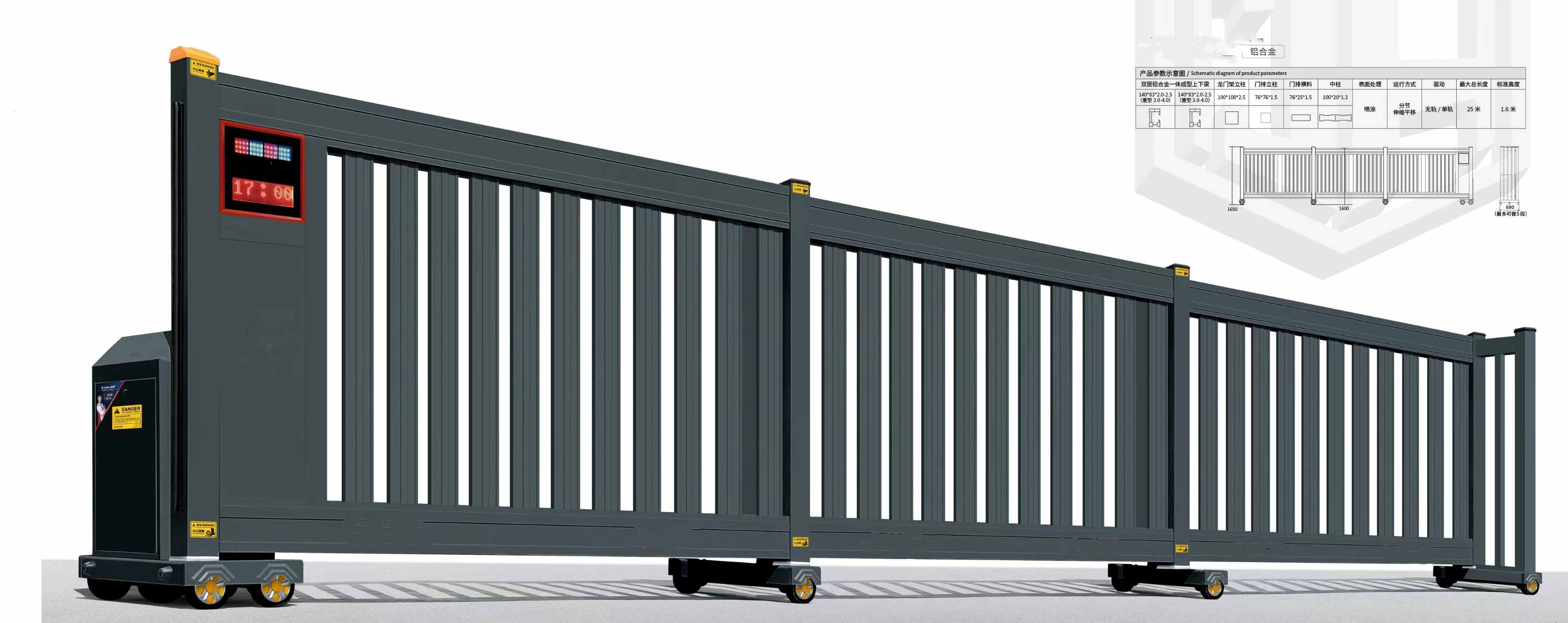 1.4輪驅(qū)動:運行快捷、平穩(wěn)、不打滑、牽引力達(dá)300N。 2.專用耐磨輪:直徑120mm加大橡膠耐磨輪選用進口PVC材料制作,在30米行程里通過次來回測試,行走輪無明顯磨損可用3-5年時間,由于輪子直徑大,風(fēng)雨后不影響電動門的正常運行。 …